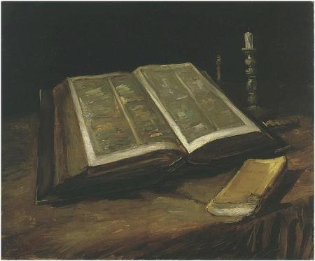 梵谷於即將離開紐倫之前(1885.10),畫了一幅靜物畫,畫中有一本大本聖經、一本左拉的小說,以及兩只沒有了燭火的燭台。這幅畫,與其說是靜物,不如說是梵谷透過繪畫做出一個宣告、一個告別式。 梵谷出生於牧師家庭,這使梵谷強烈的宗教情懷無法避免的既連結於上帝、又連結於他的父親。他的愛上帝與他的愛父親,是糾結在一起無法切割的情感。梵谷在他寫給提奧的信中曾經說過一段心路歷程,那是在他讀寄宿學校,離開家兩週後,父親到學校來探視他,梵谷在寫給提奧的信中說:「我撲在父親脖子上....其時我和父親都感到,我們都有一個天父....。聖父,父親!」 這股愛父親即是愛上帝、愛上帝即是愛父親的情感糾結,使梵谷有一段時間效法基督一如效法父親,他誓願要成為像苦行僧一般的悲天憫人的獻身者,所以他到阿姆斯特丹的神學校作一陣子的學生後,被差派到博里納日去傳教。日後,梵谷在紐倫時期的畫作,絕大部分就是記錄博里納日帶給他的震撼——他牧養的、傳福音的人,是一群在礦區工作、貧窮而絕望的人。 其實梵谷在博里納日的傳教工作被上級判定為不適任,他們都覺得他很怪,原因是,梵谷用盡了他所有的熱情、所有的愛,在跟礦區的人一齊生活、一齊受苦、一齊哀傷、一齊向上帝祈禱,這使梵谷的衣著、食宿、談吐都跟礦區的人一樣,於是讓「教會裡的老爺們」覺得梵谷「沒有教養」,這些老爺們認為任何人一旦看到梵谷這種邋遢、貧寒的模樣,就不再有可能羨慕作神的兒女,梵谷會成為「反見證」。梵谷在這種「不適任」的判定中,是深深受到傷害的,他心中感受到的被遺棄,不只是自己、也是礦區這些可憐人的被遺棄。 而後,梵谷曾為了礦區的可憐人,跟礦場主人(也是教會的會友)討公道,卻被這會友斥為「瘋子」,叫人把他攆出去。 這段遭遇,使梵谷內心深處對上帝、對人的火熱愛情,與教會、神學院的宗教體制分離。他仍舊抱持對上帝的忠誠的愛,但他無法再信任教會。但梵谷的父親卻是教會的牧師。於是梵谷對父親的情感糾結又更複雜了。他需要父親、但他也遠離父親;他依賴父親的愛、但他也反叛父親。 但梵谷的父親其實是深愛梵谷的,他始終如一的對梵谷的現況與未來擔憂,他不知道梵谷何時才能自食其力、不再需要仰賴家庭對他的經濟援助。這種擔憂,也很容易被梵谷視為父親對他不信任、不肯定。(當父親的擔憂終究是事實,因為梵谷這一生一直在依賴家庭的援助,這忠誠的援助者就是梵谷的弟弟提奧。) 1885年3月,梵谷的父親過世。梵谷從這一刻知道:他的人生從此將前後判若兩極。 於是他畫下了這幅靜物畫。畫中的聖經佔了畫面幾乎二分之一的篇幅,這意味上帝在梵谷心目中一直佔有的份量;在聖經下方,是梵谷深深敬愛的文學家左拉的作品《生命的喜悅》(La Joie de vivre)。左拉在當時是有名的激進份子,他的文學作品大量暴露下層社會的痛苦絕望,以及隨絕望而來的墮落,對梵谷而言,左拉句句屬實,每一個揭露一如梵谷畫作中的揭露,都是在為之吶喊為之抱不平為之伸冤,但中規中矩的教會人士卻將左拉的作品視為醜陋的淫穢之書。左拉被教會審判,但梵谷敬重左拉。而梵谷在繪圖中將左拉的作品只佔據畫面右下角,幾乎只是聖經的五分之一大小,也意味在梵谷心目中,左拉再偉大,仍不可能竊奪掉神聖的上帝。 不過,這幅畫最奧妙的地方,卻是那兩只熄滅的蠟燭。從梵谷對教會對父親糾結在一起的情感,這兩只熄滅的蠟燭,既是指父親的過世,也是指教會失卻見證的現狀——他知道教會是怎樣無視於下層社會的痛苦的,這種冷漠,無疑是信仰的死亡。 梵谷以這幅畫作為一種宣告、一種告別式,之後,他永遠的離開了荷蘭,去到法國,把他熱烈的、悲憫的、聖徒的、苦修的宗教情感,轉化成藝術的熊熊烈火,他用對比鮮明、蘊含主觀情感的色彩,作成如今我們所知曉的梵谷。 | |||